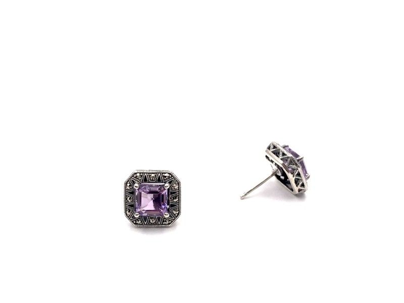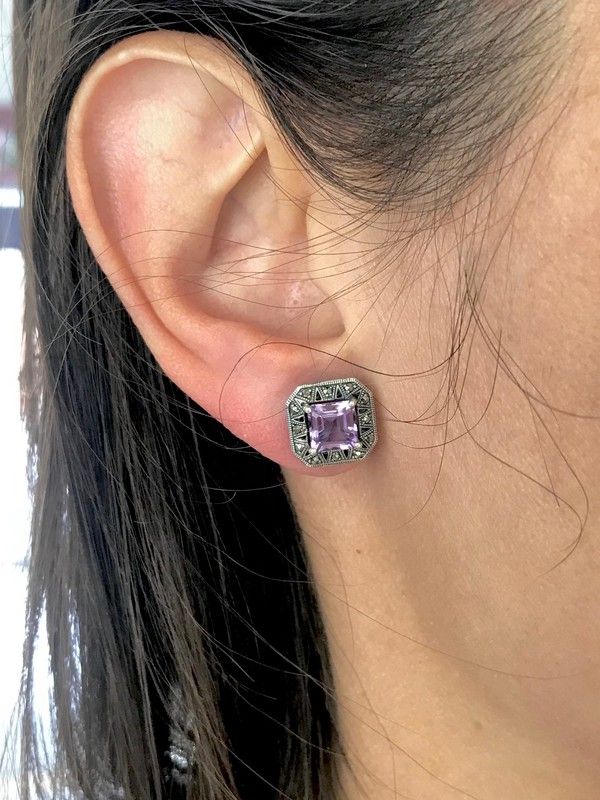Brincos quadrados feitos em prata de lei com ametistas naturais e pedras marquise. Sua aparência envelhecida confere-lhes um toque elegante e sofisticado.