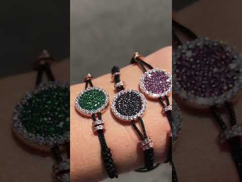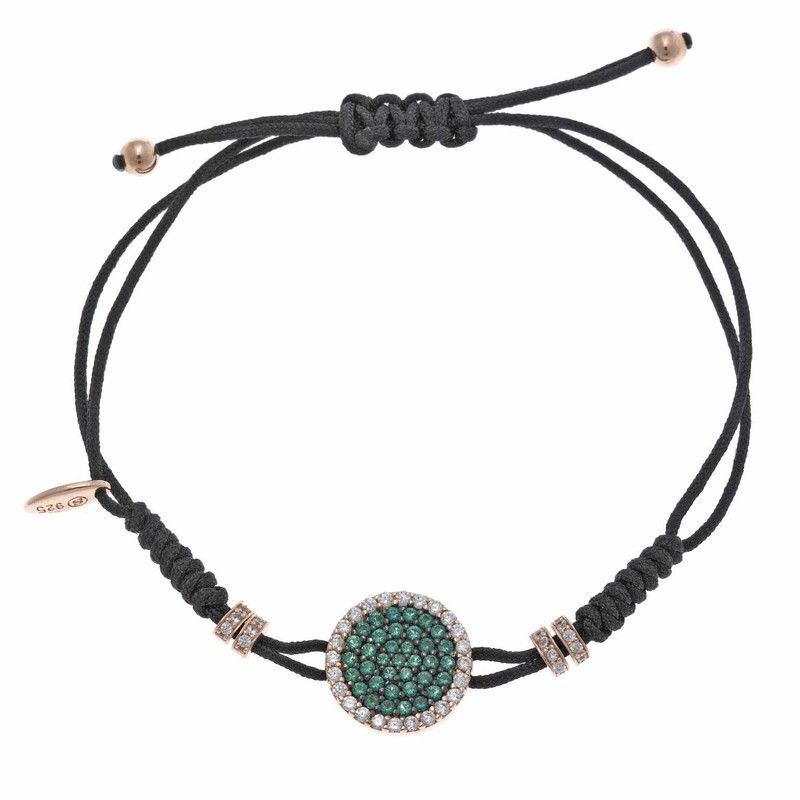 Pulseira em prata folheada a ouro rosé com zircônias brancas e verdes. Fio de nylon preto ajustável.