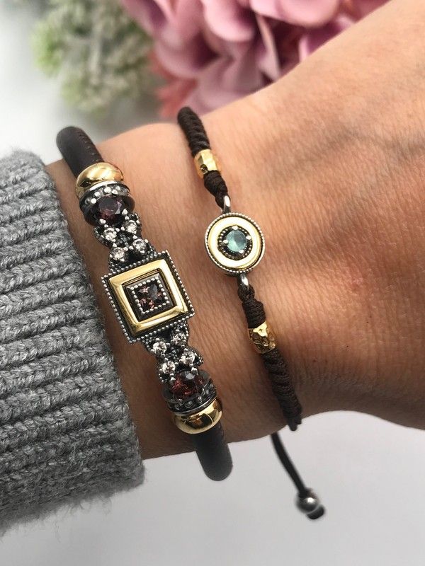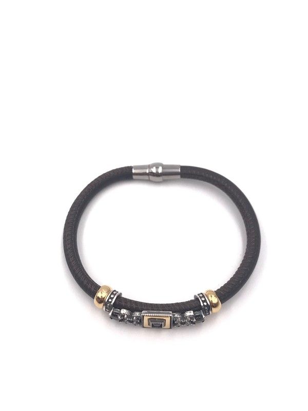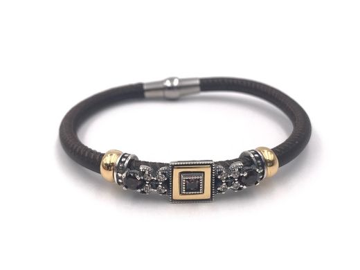 Pulseira artesanal em prata de lei envelhecida com detalhes banhados a ouro e zircônias cúbicas marrons. A pulseira de couro possui fecho magnético para facilitar a colocação e retirada. Desenhada e fabricada na Espanha. Modificações são possíveis (sob consulta).