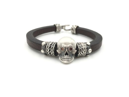 Pulseira de caveira unissex com olhos em zircônia marrom e couro marrom. Feito à mão com detalhes delicados.
