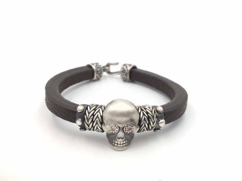 Pulseira unissex em prata com caveira e couro marrom