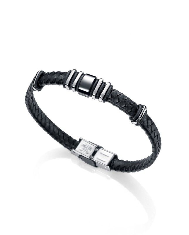 Pulseira masculina com detalhes em couro trançado preto e aço inoxidável, combinada com revestimento IP preto.